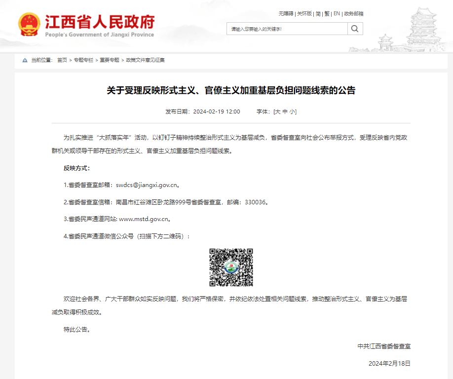 央广网南昌2月21日消息(记者刘培俊)2月18日,江西省委督查室发布《关于受理反映形式主义、官僚主义加重基层负担问题线索的公告》,为扎实推进“大抓落实年”活动,以钉钉子精神持续整治形式主义为基层减负,省委督查室向社会公布举报方式,受理反映省内党政群机关或领导干部存在的形式主义、官僚主义加重基层负担问题线索。