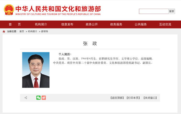 据文化和旅游部官网“部领导”栏目显示,张政已任文旅部党组副书记、副部长。