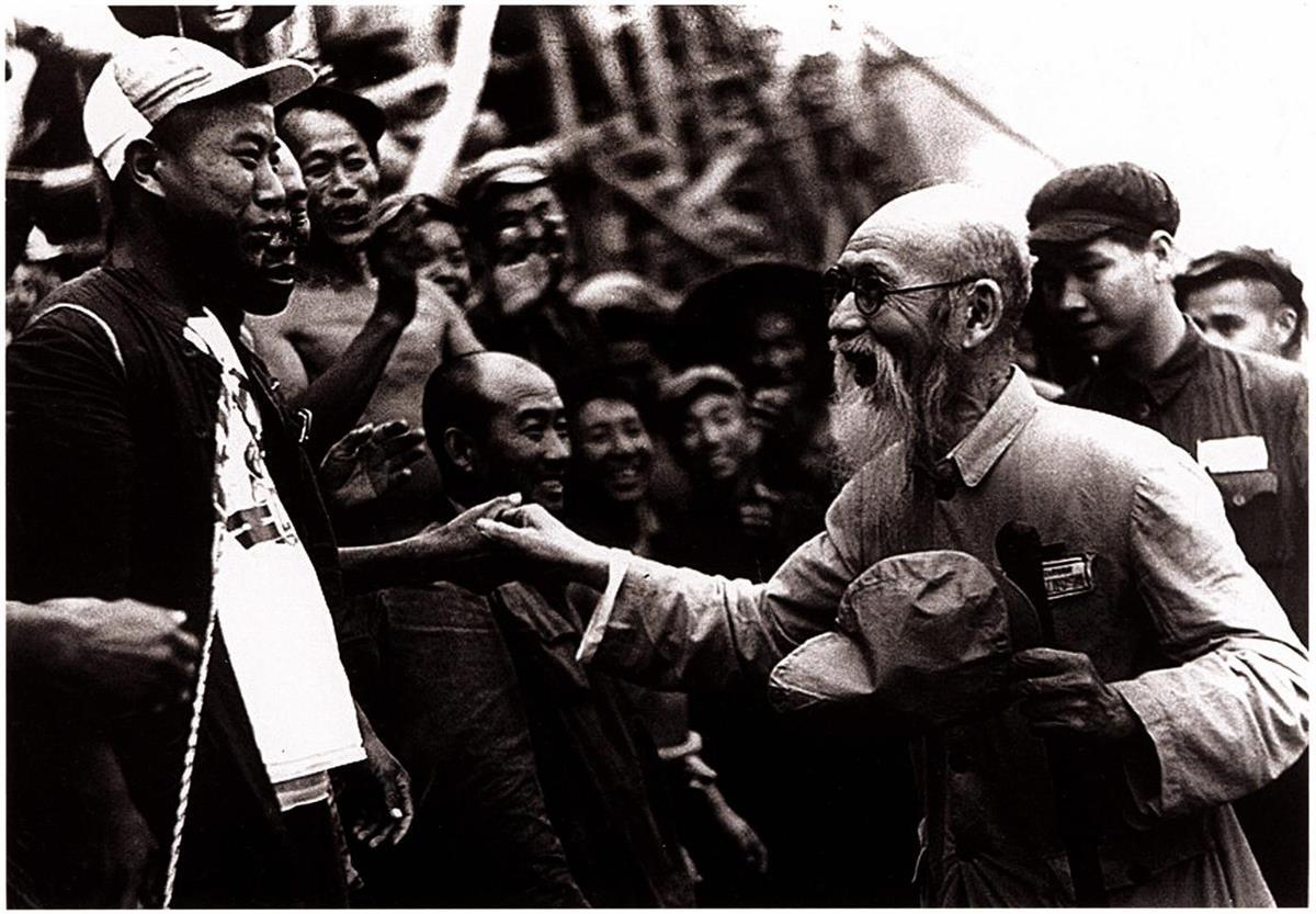 1952年3月张难先慰问荆江分洪工地民工(湖北省档案馆供图)
