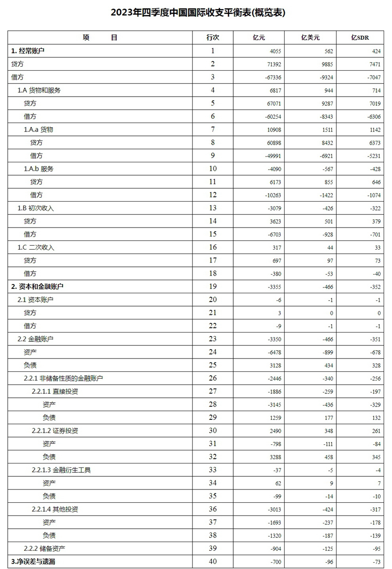 2023年四季度,我国经常账户顺差4055亿元,资本和金融账户逆差3355亿元,其中,非储备性质的金融账户逆差2446亿元,储备资产增加904亿元。