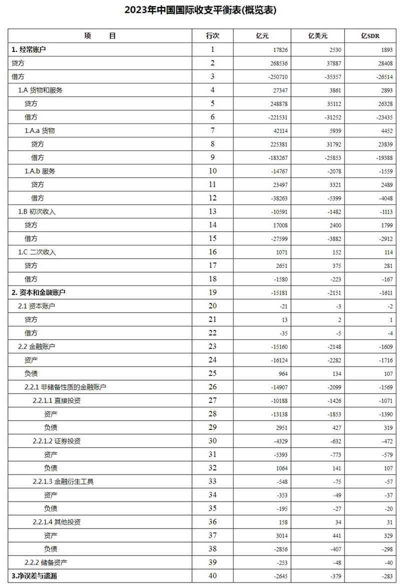 2023年,我国经常账户顺差17826亿元,资本和金融账户逆差15181亿元,其中,非储备性质的金融账户逆差14907亿元,储备资产增加253亿元。