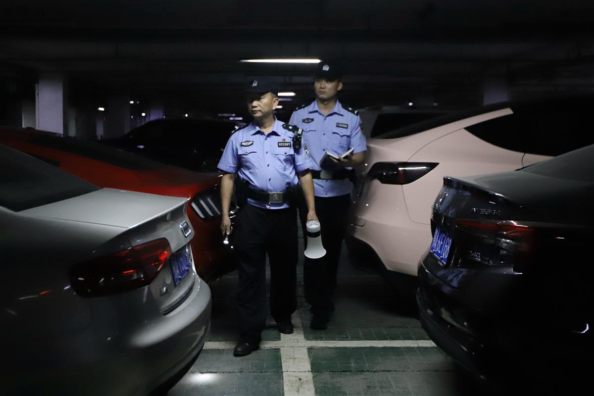 武汉民警张文昌(左一)带队夜巡,看小区车主是否关好车窗