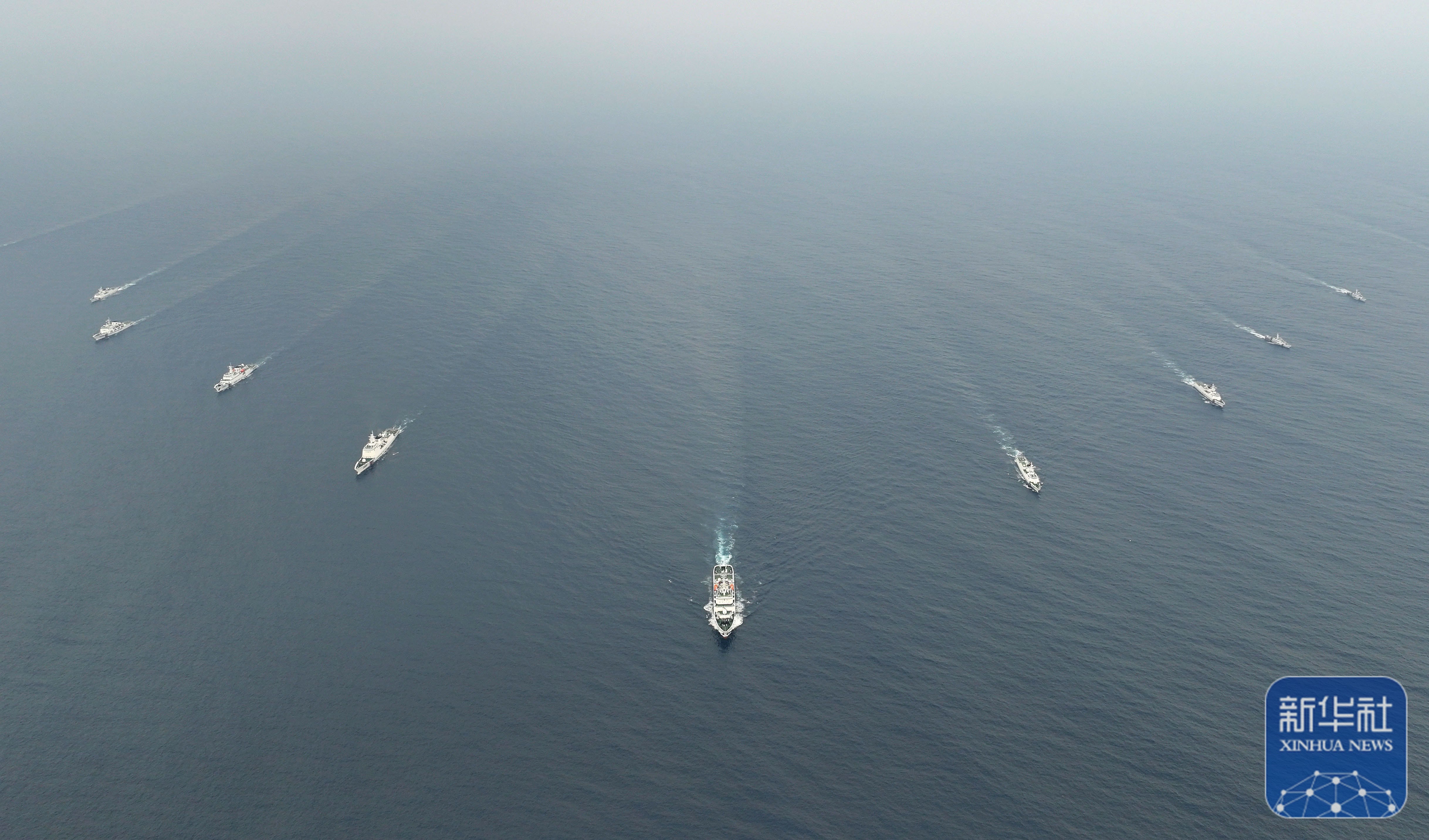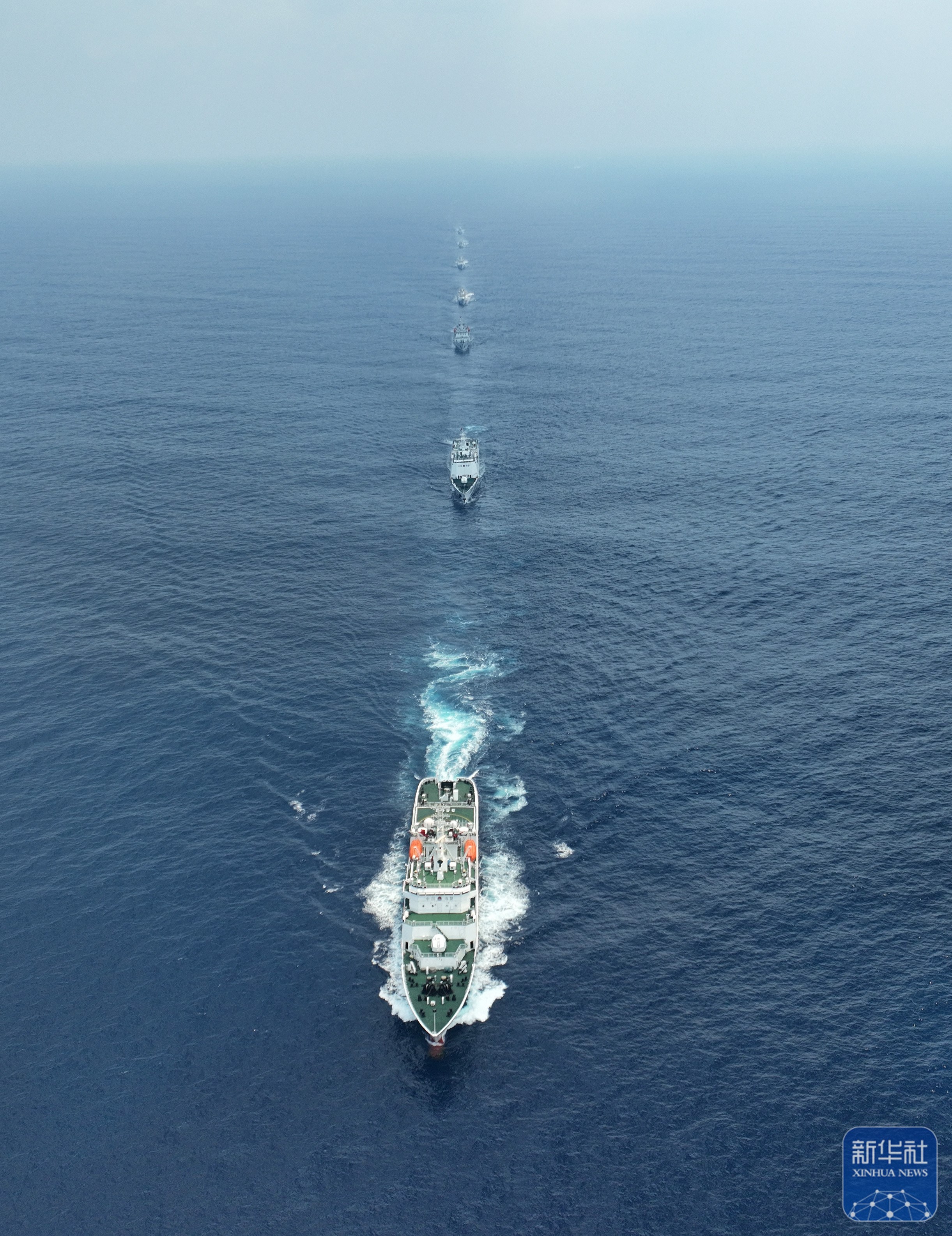 5月17日,中国海警3502编队在南海黄岩岛海域进行舰艇编队运动训练(无人机照片)。新华社发(谭冉摄)