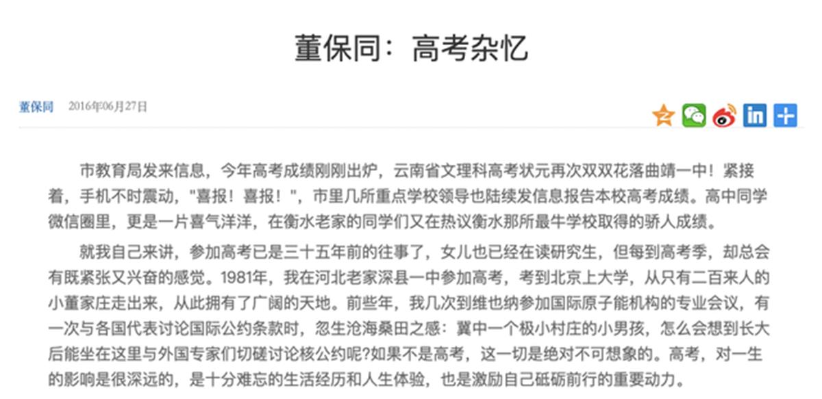 “1981年,我在河北老家深县一中参加高考,考到北京上大学,从只有二百来人的小董家庄走出来,从此拥有了广阔的天地。”董保同曾在《高考杂忆》一文中写道,当时的学制与现在大不相同,“我是最后一届二年制初中、二年制高中的毕业生。”他还写道,自己阴差阳错考了全县第一名(据说也是衡水地区第一名)。