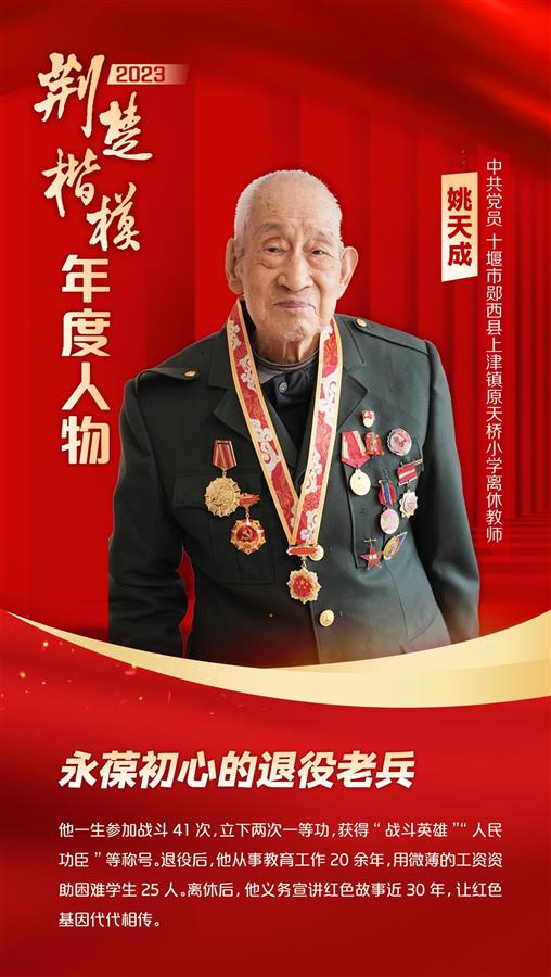 近日,湖北省委宣传部发布荆楚楷模2023年度人物,十堰市郧西县上津镇原天桥小学离休教师、老兵姚天成榜上有名。