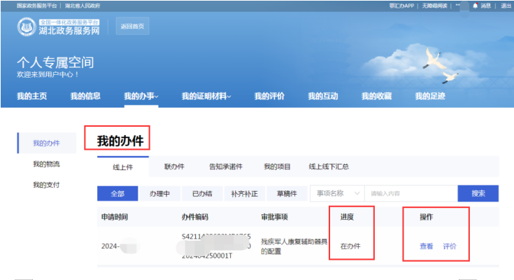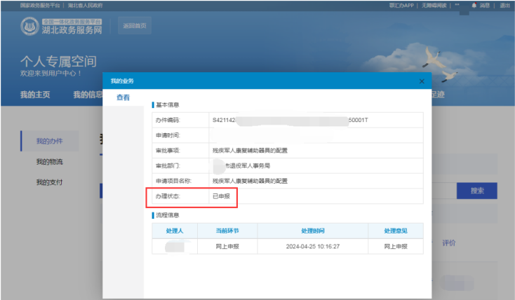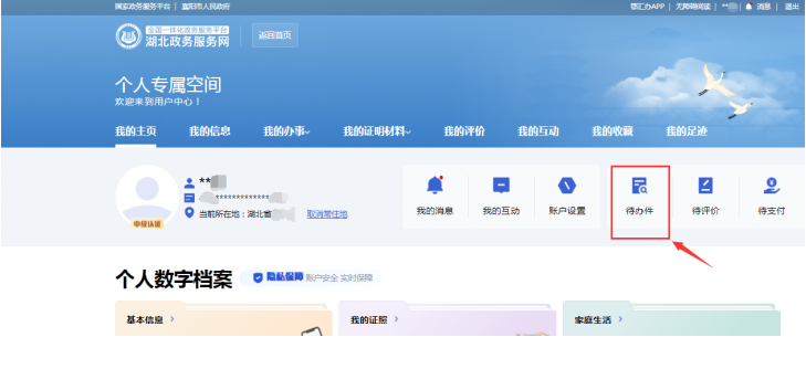 2. 申办人可以打开湖北政务服务网,登录“个人专属空间”,选择“待办件”,进入“我的办件”页面,随时查看该申请件的办理进度。