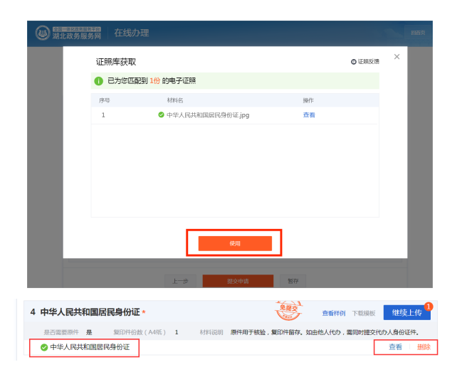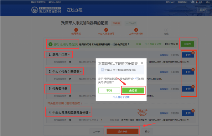 2. 授权成功后,该证照将上传至湖北政务服务网平台。其他没有标注“免提交”的证照,点击对应证照右侧的“上传”按钮,上传该证照。