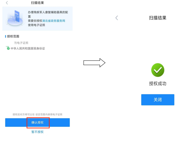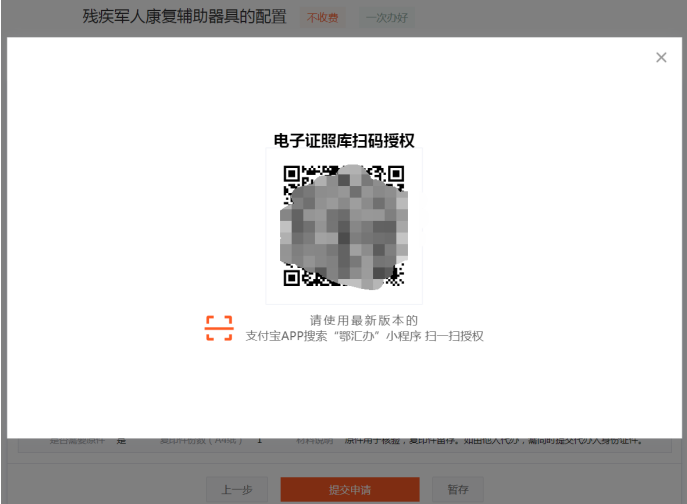 1. 根据系统提示上传申请材料。若系统提示“本事项有以下证照可免提交”,点击“去授权”,页面将弹出“电子证照库扫码授权”页面,请使用最新版本的支付宝APP搜索“鄂汇办”小程序扫二维码授权。