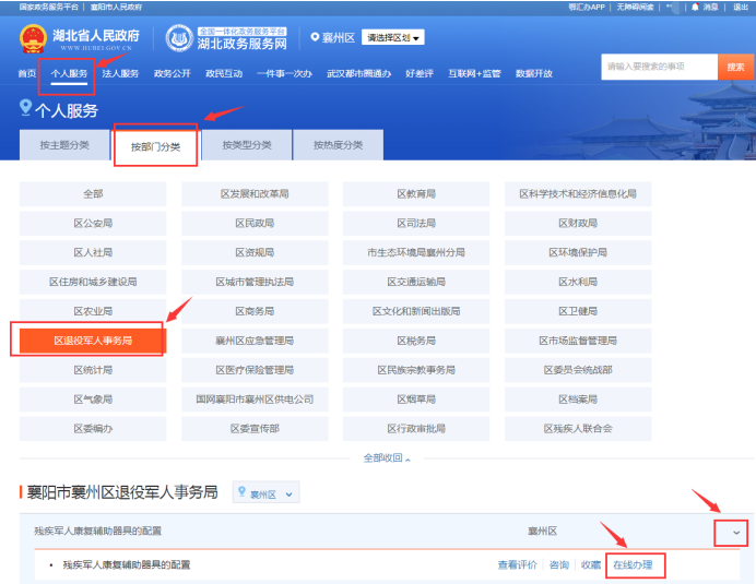 2.点击“个人服务”,选择“按部门分类”,选择“区退役军人事务局”,点击事项“残疾军人康复辅助器具的配置”右端的下标符号,打开该事项,点击“在线办理”。