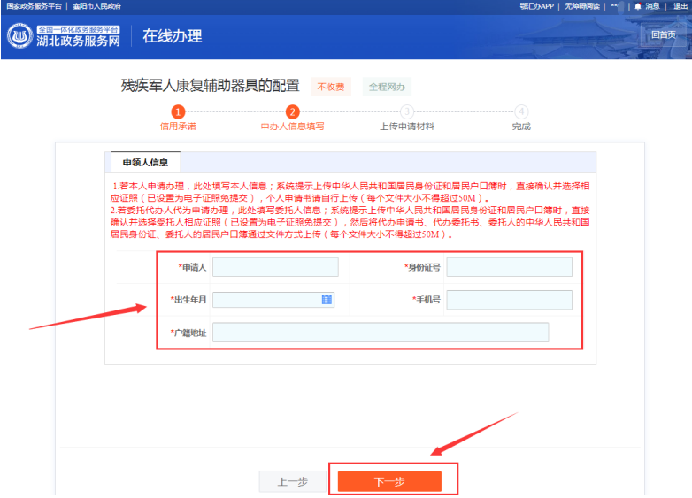 1. 进入“申办人信息填写”页面,根据系统提示填写“申领人信息”,若残疾军人本人申请办理,此处填写本人信息;