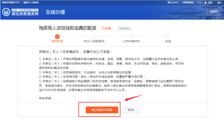 3. 网页跳转至“残疾军人康复辅助器具的配置”“信用承诺”填报页面后,点击“我已阅读并承诺”。