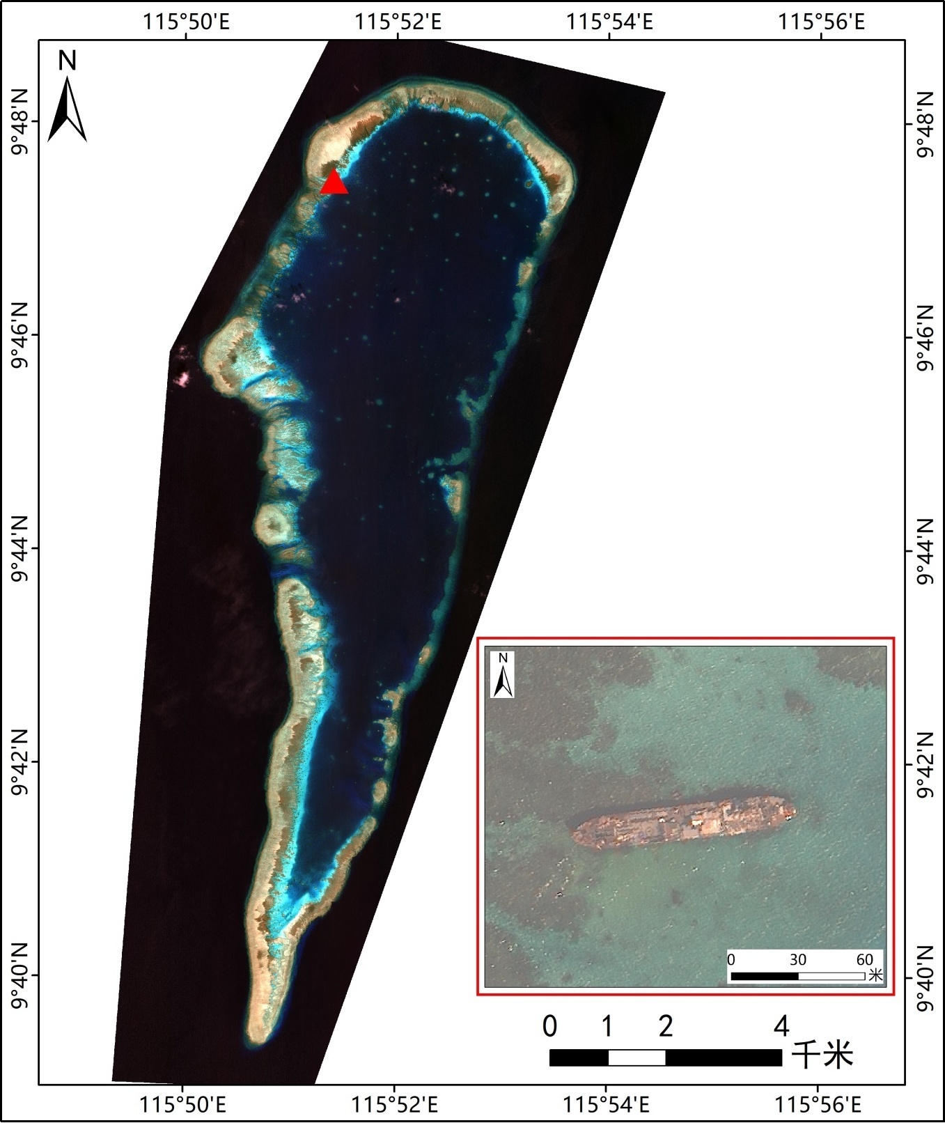 非法“坐滩”军舰(红色△)在仁爱礁区位示意图及局部放大图
