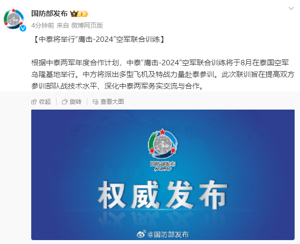据@国防部发布 微博消息,根据中泰两军年度合作计划,中泰“鹰击-2024”空军联合训练将于8月在泰国空军乌隆基地举行。中方将派出多型飞机及特战力量赴泰参训。此次联训旨在提高双方参训部队战技术水平、深化中泰两军务实交流与合作。