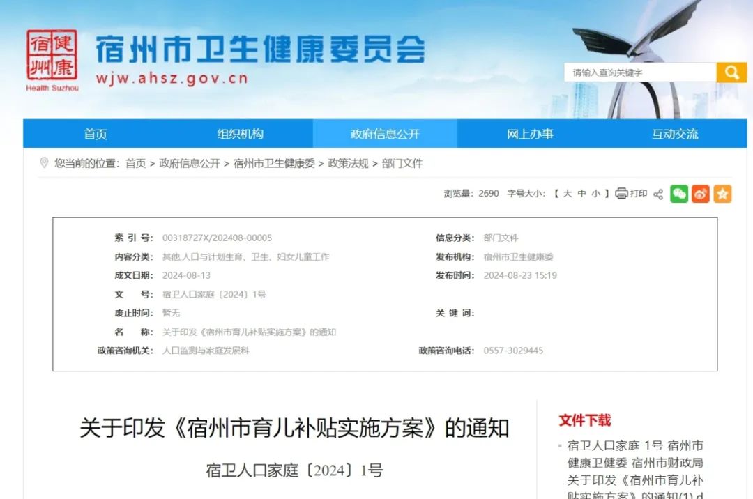 近日,为进一步落实落细生育支持措施,宿州市卫生健康委、财政局印发《宿州市育儿补贴实施方案》,明确对全市符合政策生育二孩、三孩的家庭给予一次性补贴。