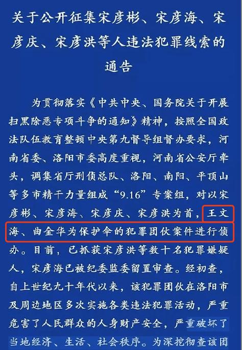 2021年,河南省公安厅发布关于公开征集宋彦彬、宋彦海、宋彦庆、宋彦洪等人违法犯罪线索的通告。其中就提到,王文海、曲金华为该案件保护伞。