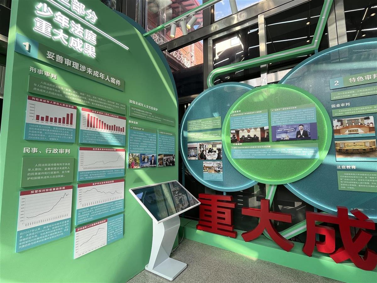 此次展览共包括未成年人审判发展历程、未成年人法律保护体系、少年法庭重大成果、“护苗成长”普法宣传课程及先进典型五部分。