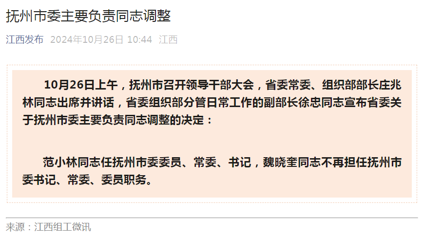 范小林同志任抚州市委委员、常委、书记,魏晓奎同志不再担任抚州市委书记、常委、委员职务。