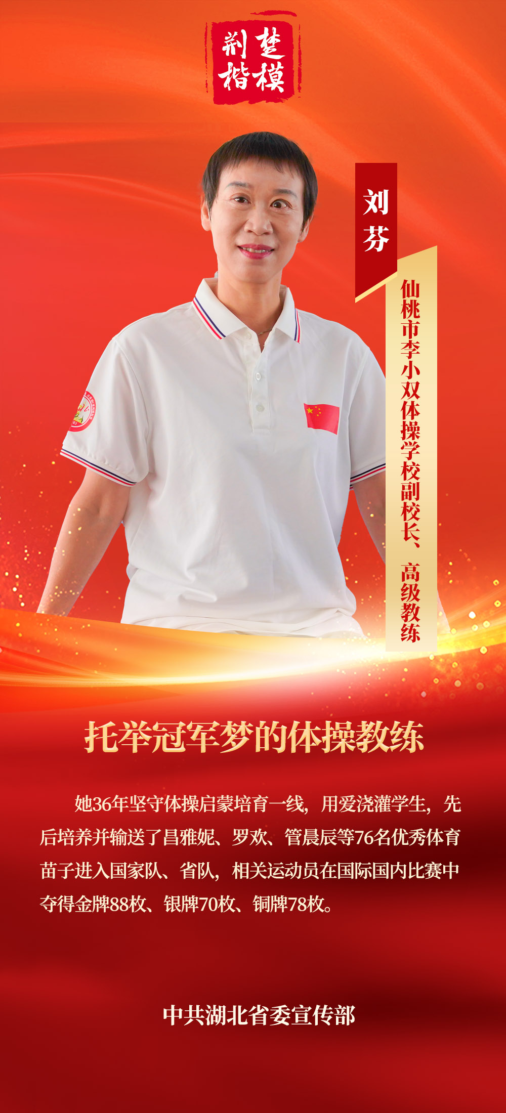 近日,2024年第三季度“荆楚楷模”上榜人物名单揭晓,湖北省仙桃市李小双体操学校副校长、高级教练刘芬上榜。她36年坚守体操启蒙培育一线,培养输送的运动员共夺得金牌88枚。
