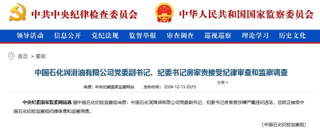 中央纪委国家监委网站12月13日讯 据中国石化纪检监察组消息:中国石化润滑油有限公司党委副书记、纪委书记房家贵涉嫌严重违纪违法,目前正接受中国石化纪检监察组纪律审查和监察调查。