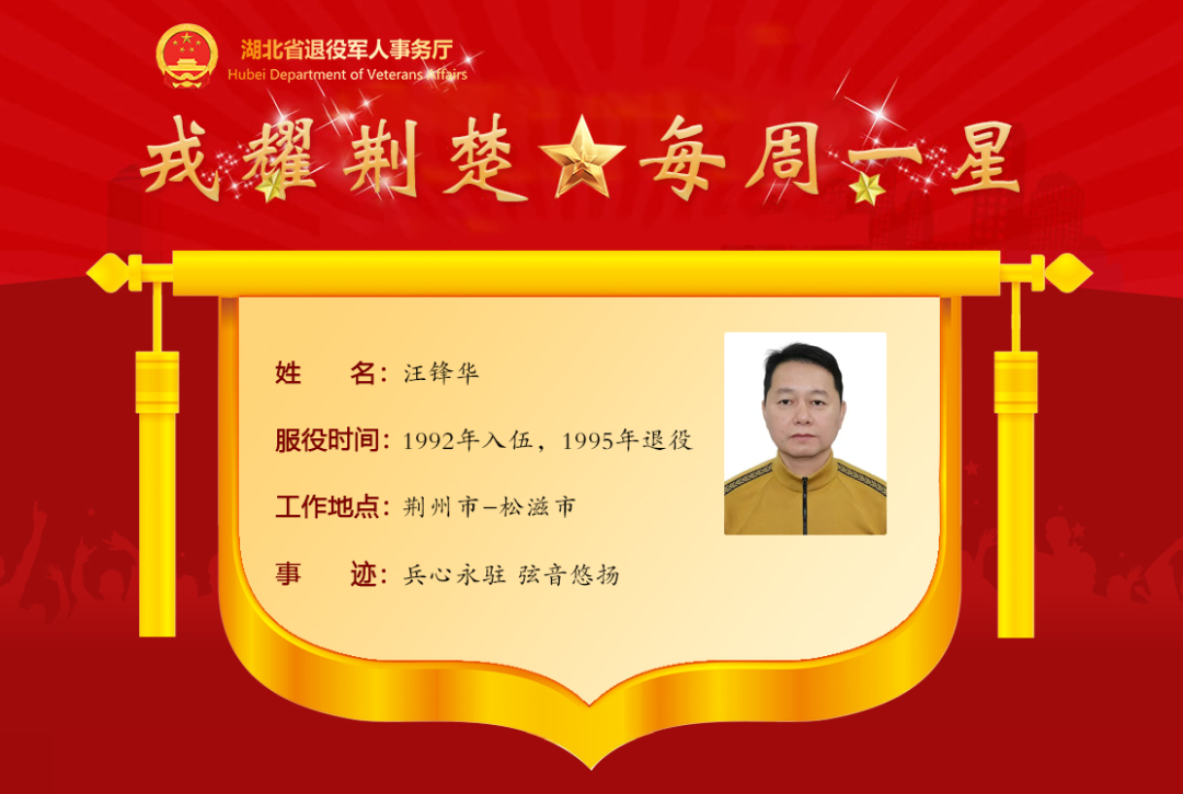 为持续讲好全省退役军人奋进新征程、建功新时代的故事,营造尊军崇军浓厚氛围,不断提升广大退役军人的尊崇感、获得感、荣誉感,推动形成先进典型不断涌现,示范带动作用更加显著的生动局面,现推出退役军人“戎耀荆楚·每周一星”系列报道。