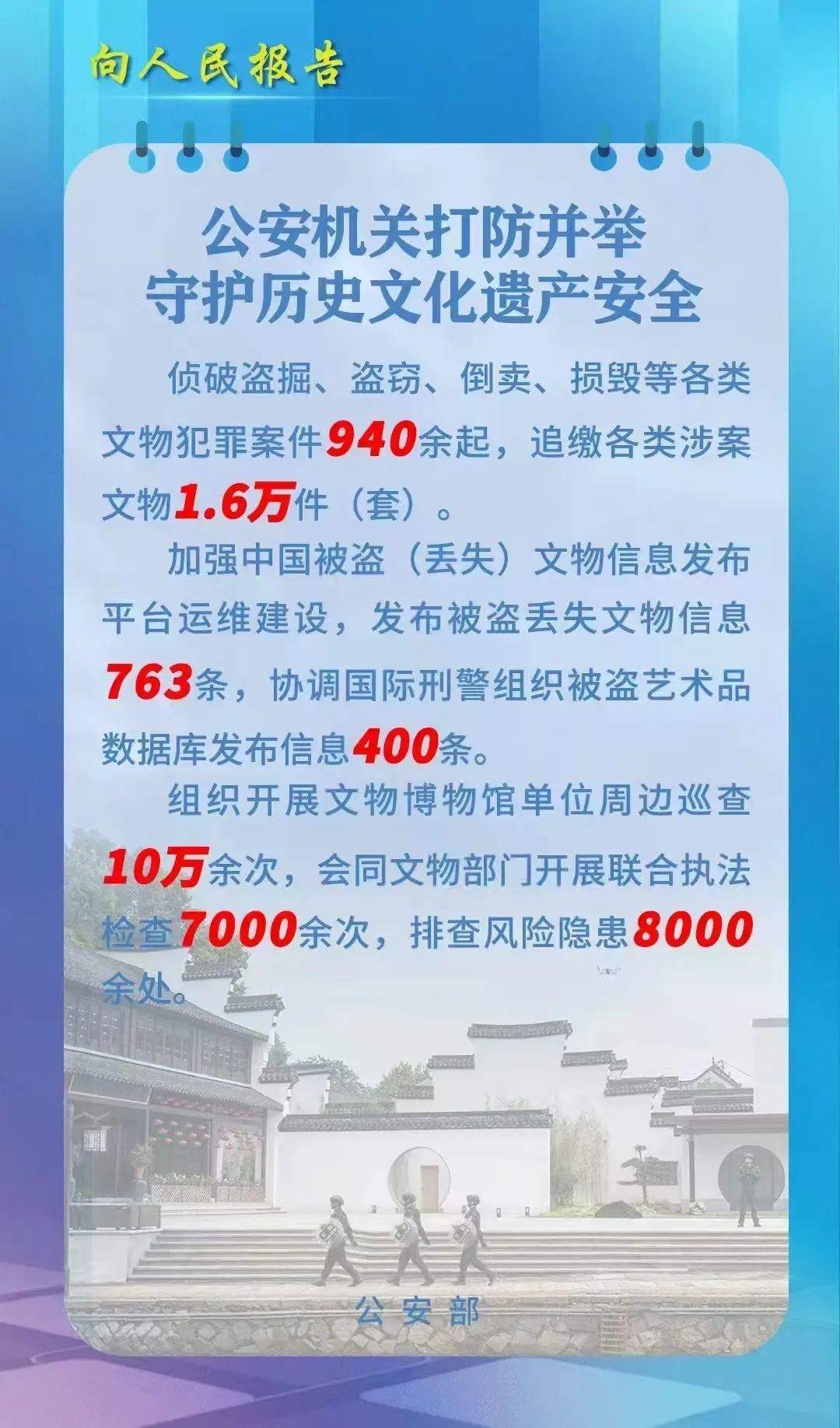 同时,各地公安机关着力加强文物保护单位治安防范能力建设,强化区域治安隐患排查整治,会同文物部门开展文物安全防范检查抽查,重点排查城乡建设施工、文物博物馆单位修缮等活动,以及大遗址保护区安全防范工作,对安全责任不落实、安全制度不完善、防范措施不到位等问题限期整改。公安机关共组织开展文物博物馆单位周边巡查10万余次,会同文物部门开展联合执法检查7000余次,排查风险隐患8000余处,为文物保护利用提供了有力保障。