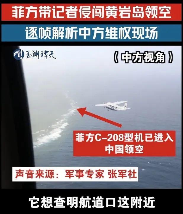 军事专家张军社对画面进行了细致分析,从飞行航迹上来看,它想查明航道口附近中国有什么船只。菲方C-208型机是政府公务机,它不是一个单纯的民用飞机,是固定翼飞机。它的吨位比我们的直升机要大,直升机的螺旋桨如果碰到它的固定翼,螺旋桨就很危险,直升机就有可能坠入海中。