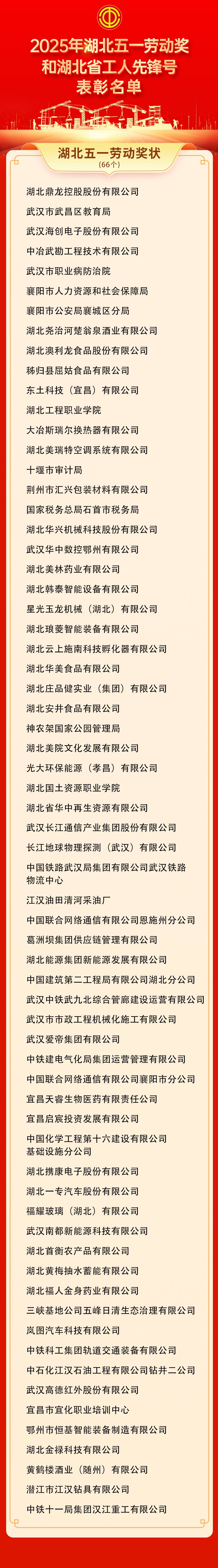 4月29日,湖北省学习贯彻习近平总书记重要讲话精神暨庆祝“五一”国际劳动节座谈会在武汉举行。座谈会宣读了《省人力资源和社会保障厅、省总工会关于表彰2025年湖北五一劳动奖和湖北省工人先锋号的决定》,授予湖北鼎龙控股股份有限公司等66个单位湖北五一劳动奖状,授予张宝剑等218名个人湖北五一劳动奖章,授予武汉钢铁有限公司热轧厂1580分厂质检三班等169个集体湖北省工人先锋号。