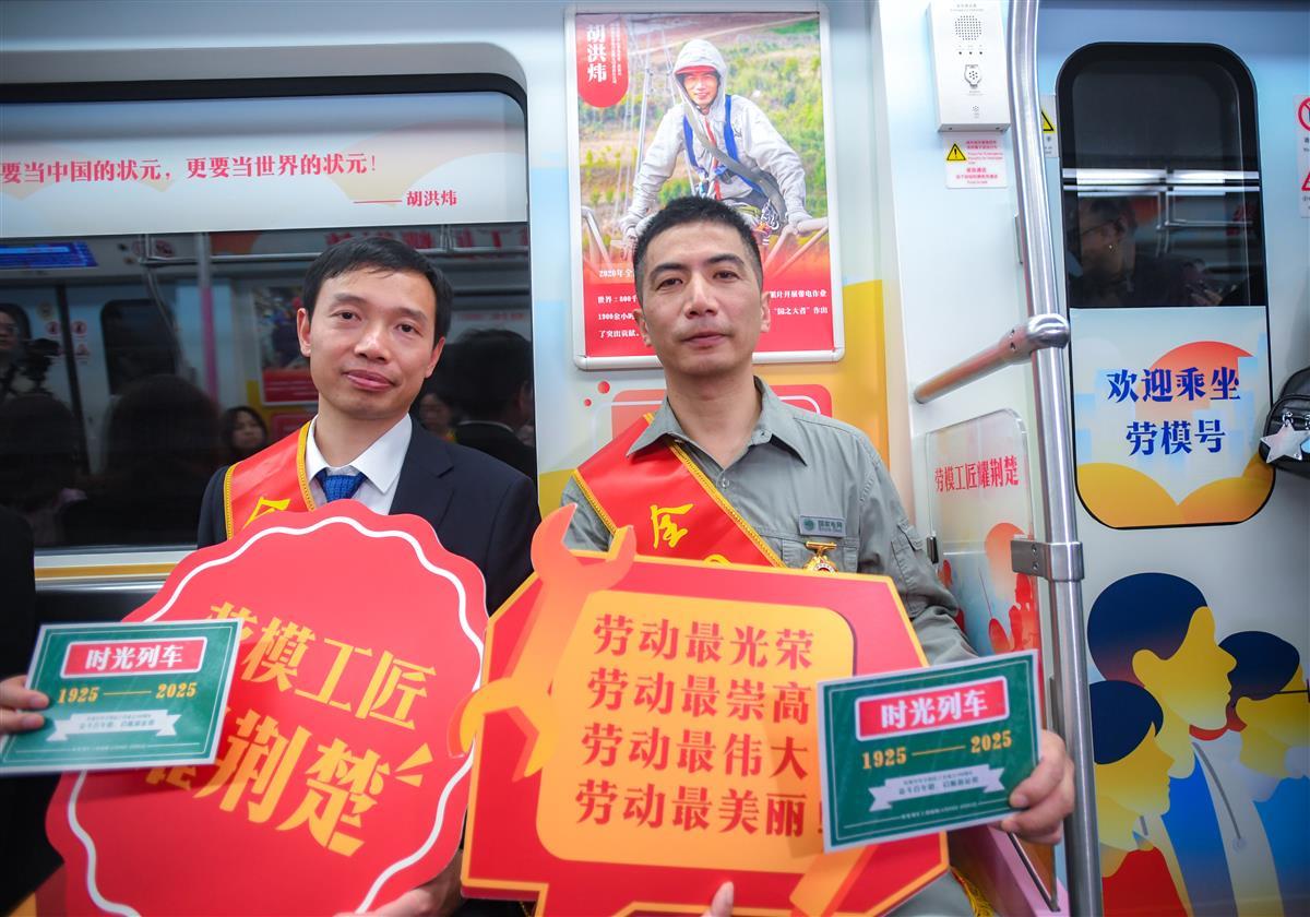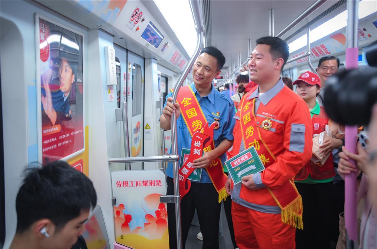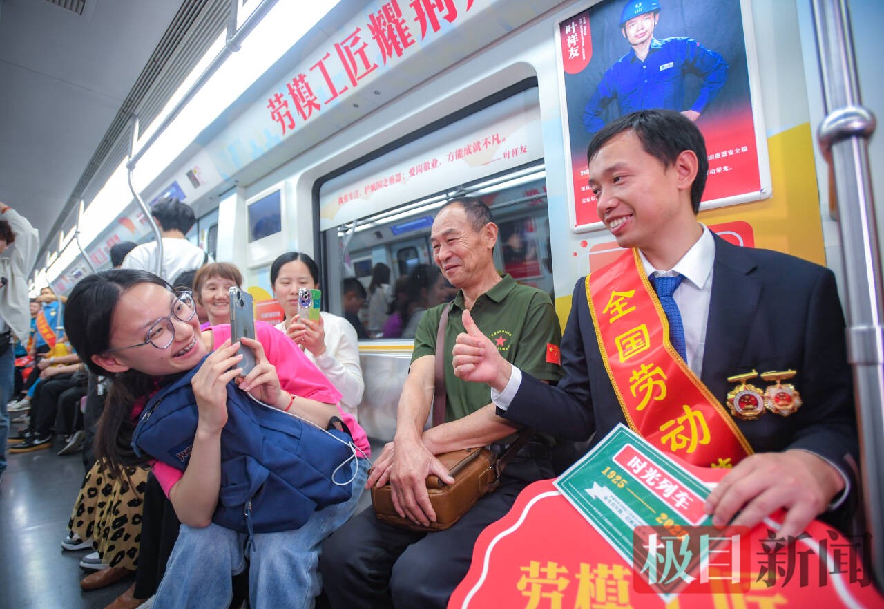4月29日,在“五一”国际劳动节即将到来之际,为庆祝中华全国总工会成立100周年,湖北省总工会联合武汉市总工会推出“五一”地铁专列主题宣传活动,邀请6名全国劳动模范登上“时光列车”“劳模号”,用特殊礼遇向全国劳动模范和先进工作者致敬。值得一提的是,这场活动还成了追星现场,乘客们纷纷上前同劳模们合影,表示“要沾沾正能量”。
