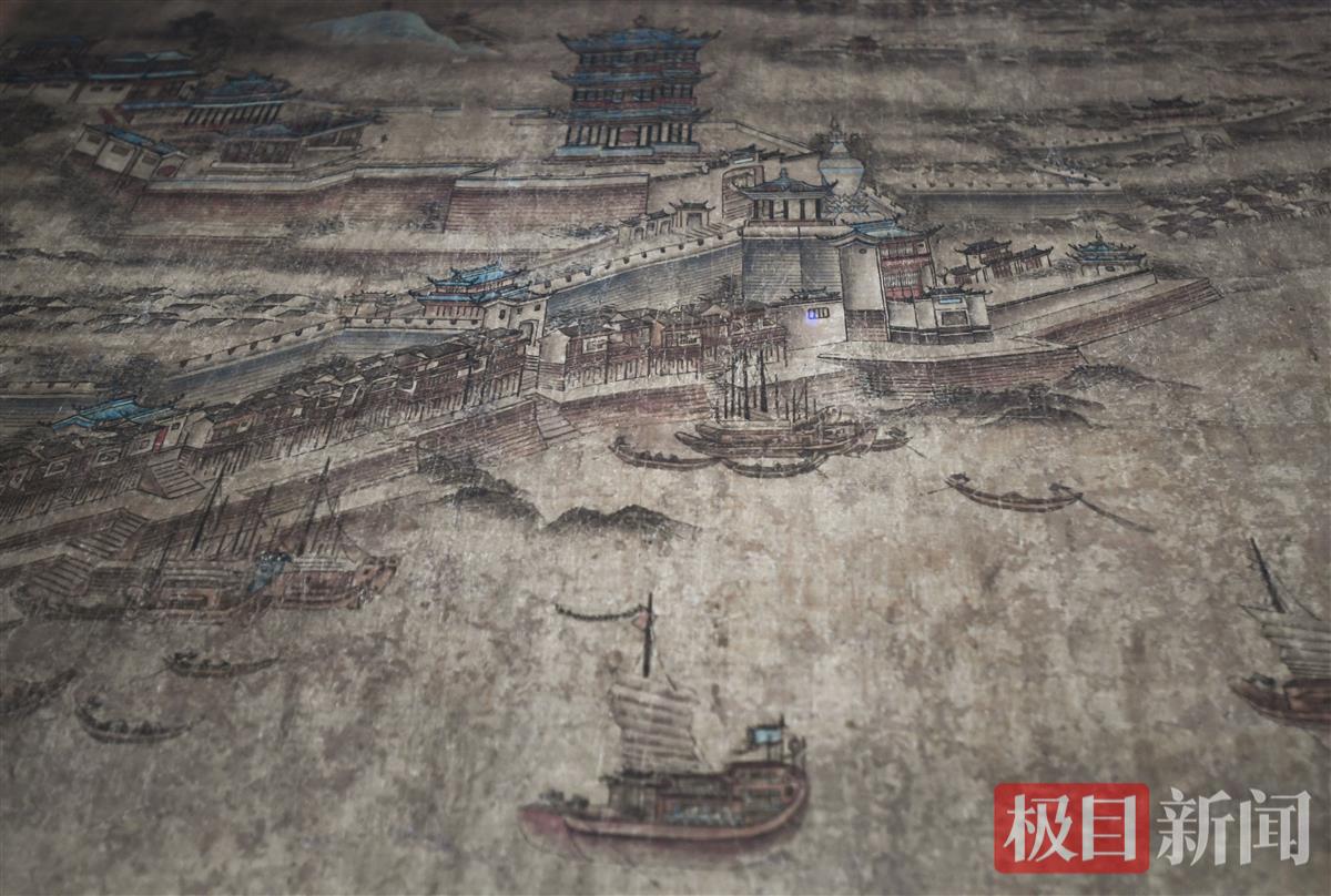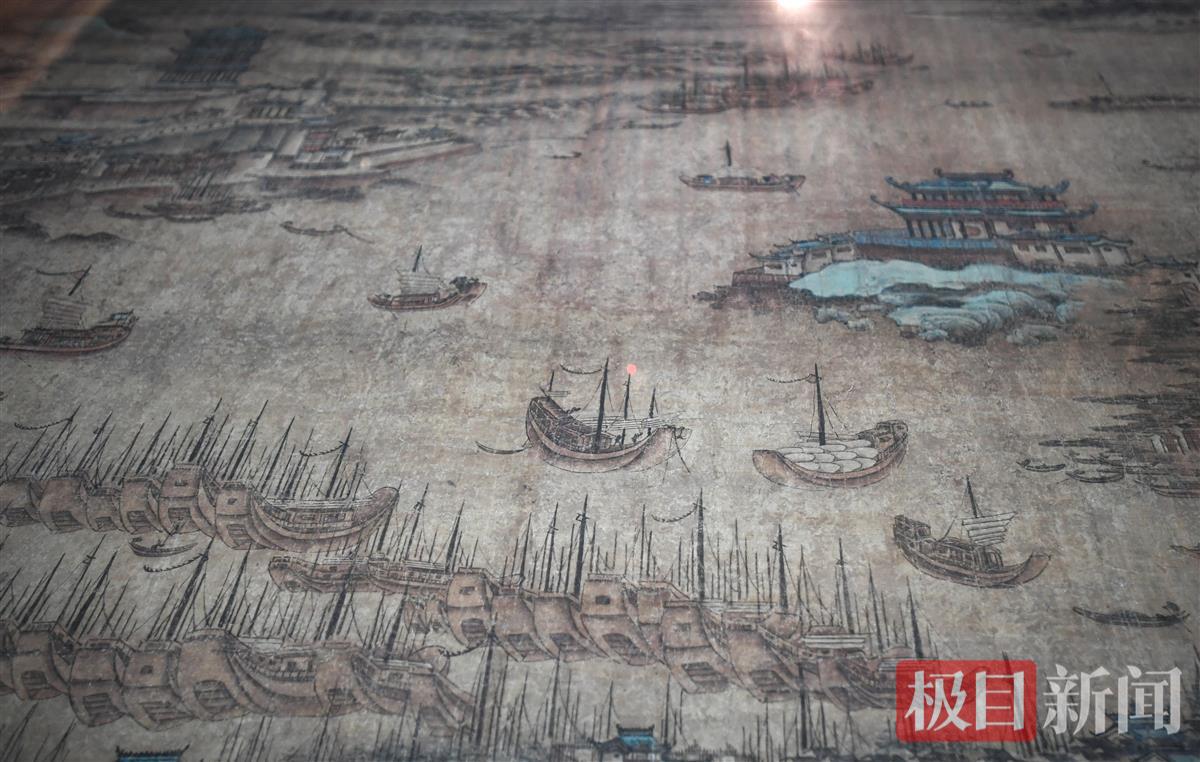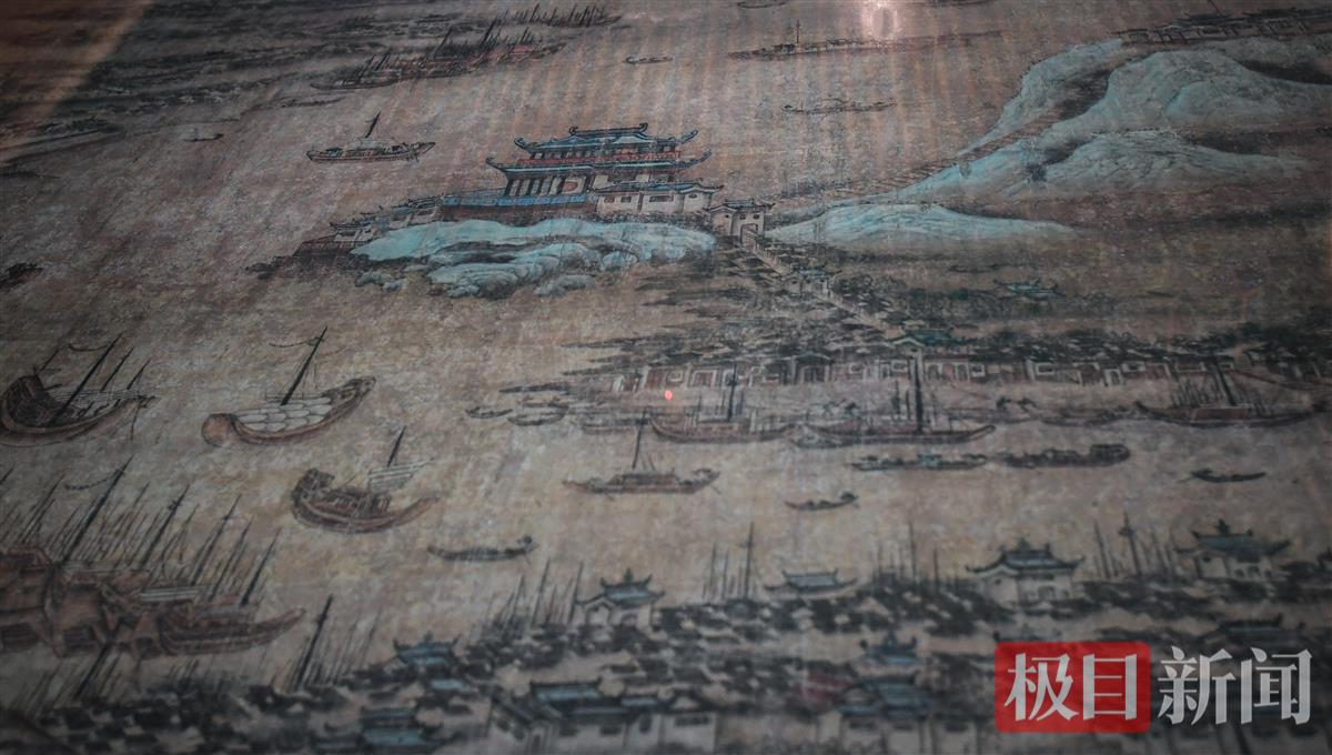 在众多展品中,明代绢本画《江汉揽胜图》尤为显眼。这幅仇英的画作,以细腻的笔触、绚丽的色彩,将武汉三镇的壮丽景色尽收画中。画面之上,长江与汉江在此交汇,江面上帆船竞发,诉说着往昔的繁华与喧嚣;武昌古城、汉阳古城巍峨耸立,见证着岁月的沧桑变迁;黄鹤楼、晴川阁遥相呼应,承载着千年的文化底蕴。