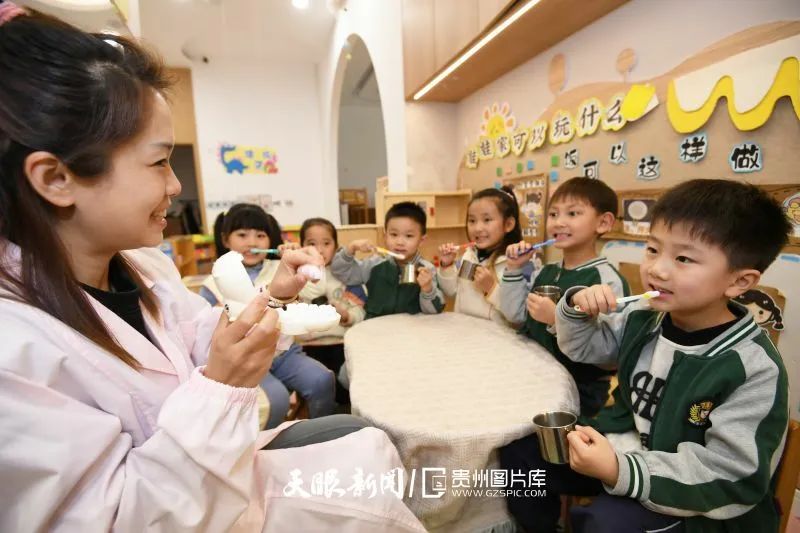 4月7日,贵阳市南明区第八实验幼儿园保健医生正在指导小朋友们如何正确刷牙。赵松摄