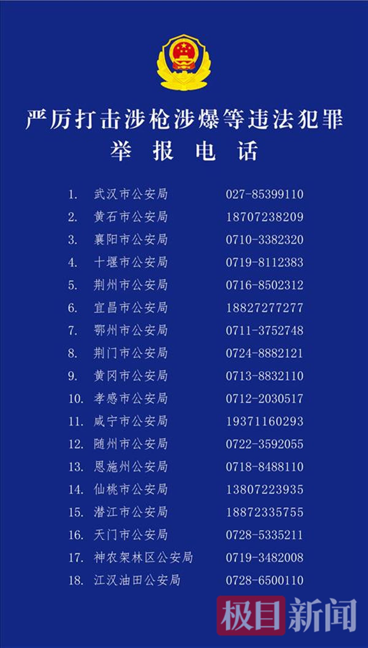 湖北公安机关鼓励、保护广大人民群众积极举报涉枪支、弹药、爆炸物品、仿真枪、弩、管制刀具等违法犯罪线索;对群众举报的相关线索将立即组织警力核查,发现涉嫌犯罪的依法及时立案侦查打击。凡举报有功的,公安机关将按规定给予奖励,并依法保护举报人的个人信息及安全;对窝藏、包庇涉枪涉爆涉弩涉刀等违法犯罪人员,帮助违法犯罪人员毁灭、伪造证据的,依法追究法律责任。