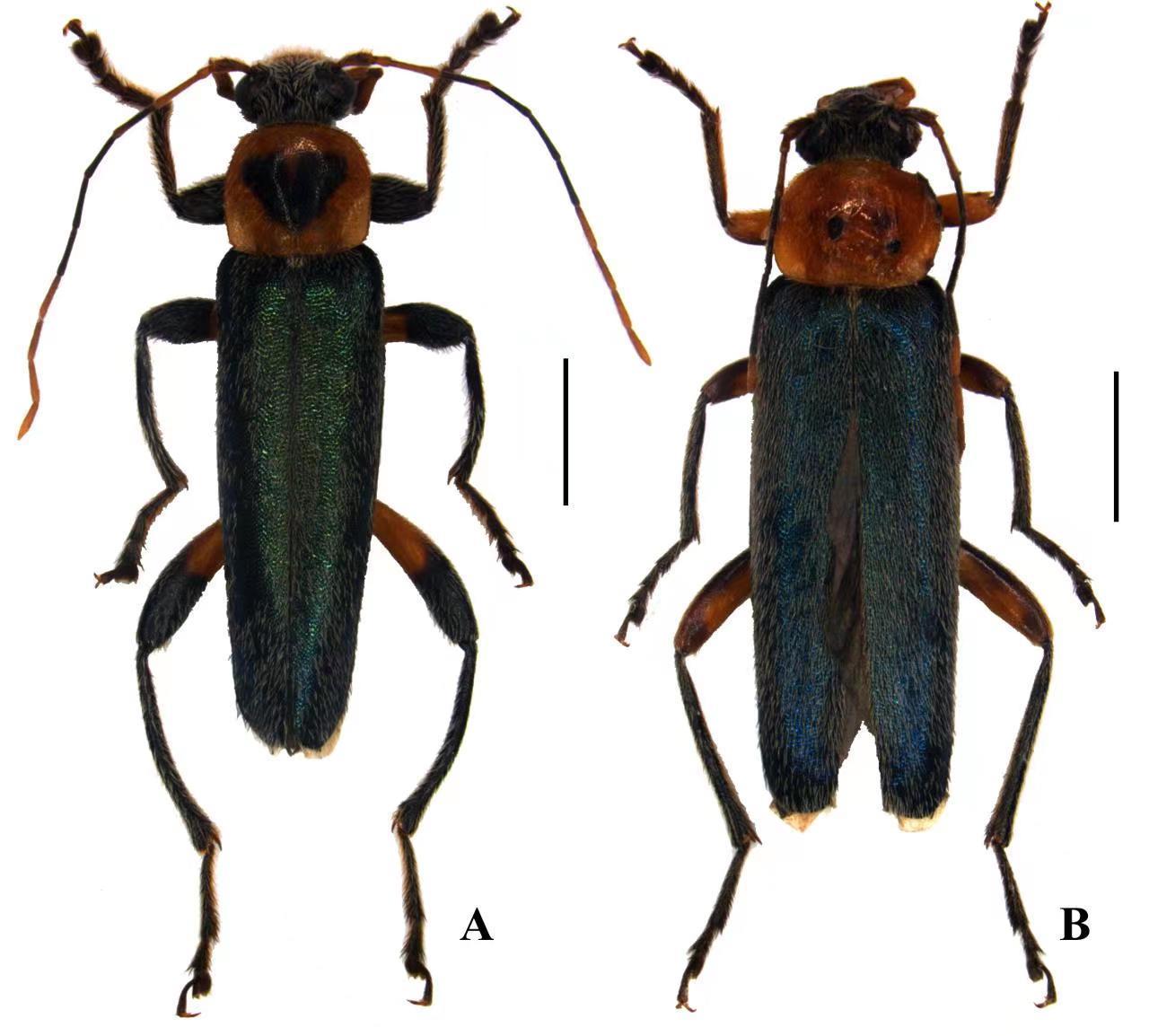 独特之处:鞘翅光滑,头部和前胸密布褐色刚毛。雌雄个体在体色和腹部特征上差异显著,为花甲属分类研究提供了关键线索。
