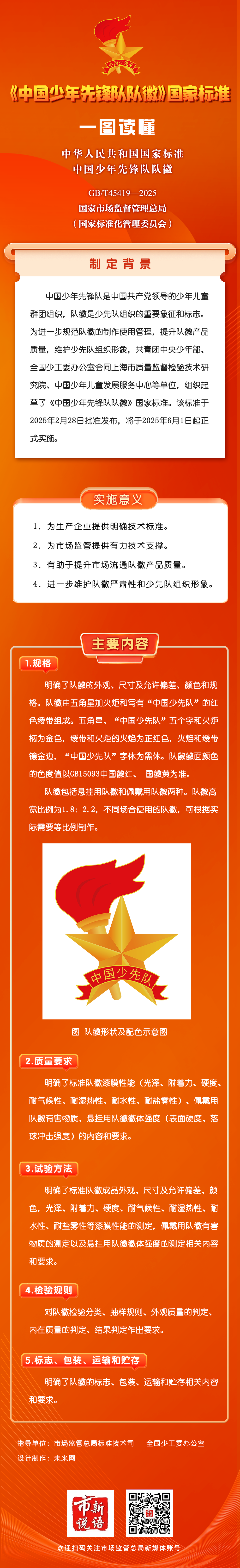 《中国少年先锋队队徽》(GB/T 45419—2025)国家标准将于2025年6月1日起正式实施。该标准由市场监管总局(国家标准委)批准发布,共青团中央、全国少工委会同相关单位编制。