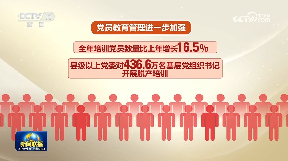 党员教育管理进一步加强。各级党组织巩固拓展学习贯彻习近平新时代中国特色社会主义思想主题教育成果,扎实开展党纪学习教育,进一步加强党员教育培训,全年培训党员数量比上年增长16.5%,县级以上党委对436.6万名基层党组织书记开展脱产培训。