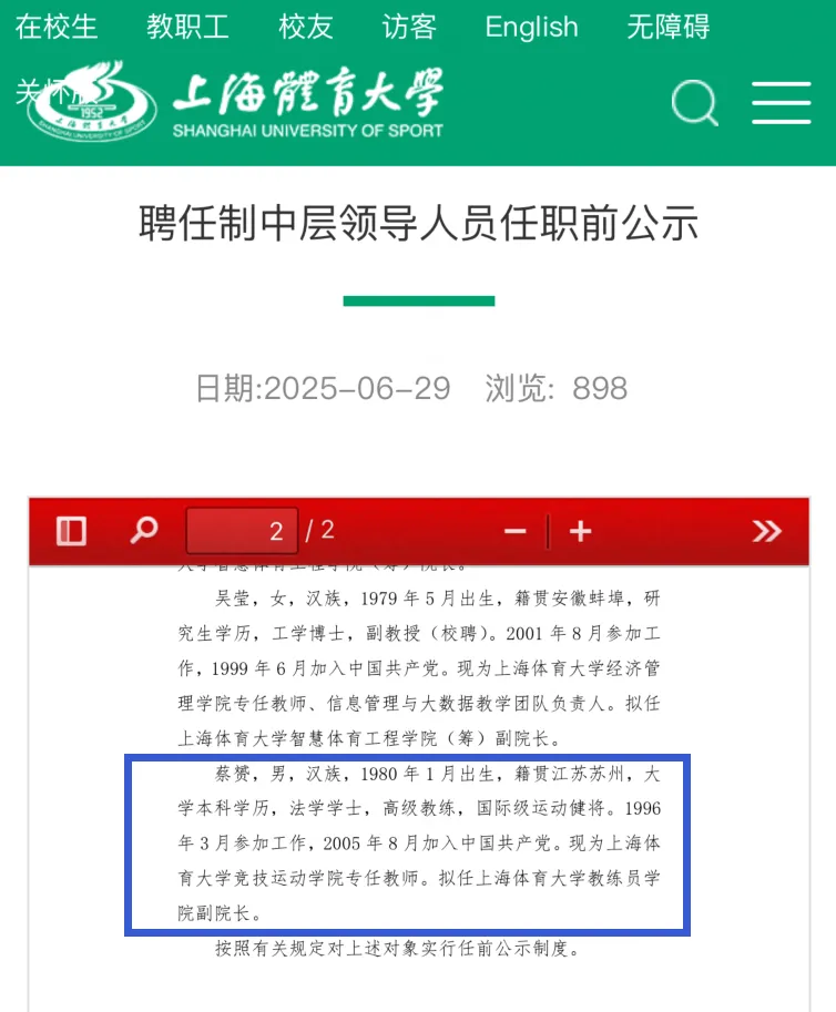 据上海体育大学官网消息,为充分发挥高层次专业技术人才在学校管理和办学治校中的作用,根据《上海体育大学聘任制中层领导人员管理办法》,经学校党委研究,决定对下列人员进行任职前公示。其中,羽毛球奥运冠军蔡赟拟任上海体育大学教练员学院副院长。