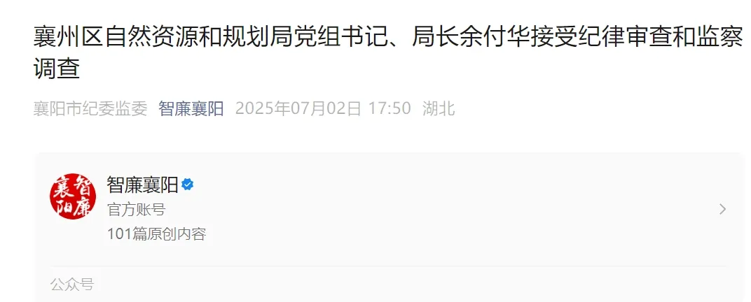 据襄阳市纪委监委消息,襄州区自然资源和规划局党组书记、局长余付华涉嫌严重违纪违法,目前正接受襄州区纪委监委纪律审查和监察调查。