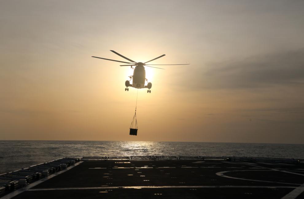 “直升机起降部署!”救治期间,一名重伤病员需要转运至后方医院。该船立即启用直升机转运的方式对危重伤病员采取直升机紧急后送。铁翼飞旋,直升机在领航员的引导下快速着舰,医疗组将危重伤病员平稳转运至机舱,直升机载着重伤员消失在茫茫海天。他们还根据任务需求,将海空立体协同贯穿训练全程,利用直升机进行物资快速补给。