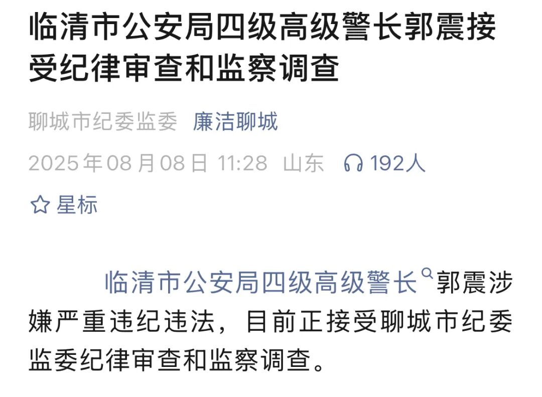 山东省临清市公安局四级高级警长郭震涉嫌严重违纪违法,目前正接受聊城市纪委监委纪律审查和监察调查。
