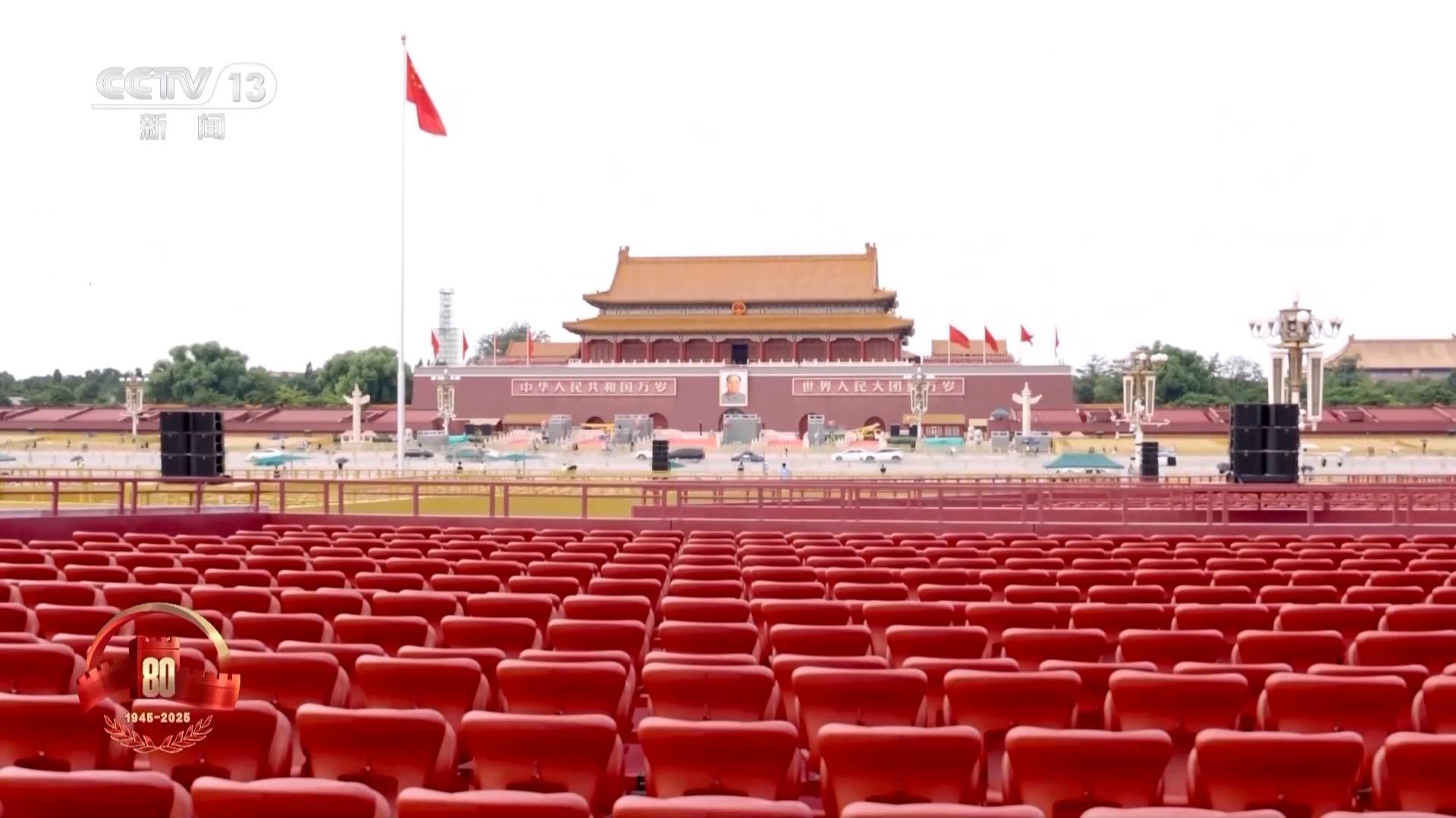 纪念活动现场,临时观礼台沿中轴线红毯呈“众”字形排布,延伸汇聚向人民英雄纪念碑。在人民英雄纪念碑的北侧,一座钢铁长城造型的年号台托举起“1945”“2025”两个金色年号。“众”和“城”作为此次纪念活动的主要设计元素,都在传递着同一个主题、同一种精神。
