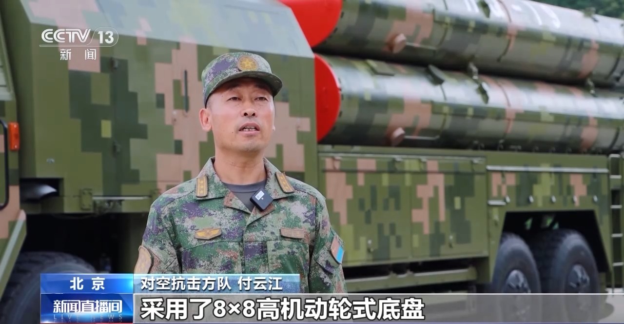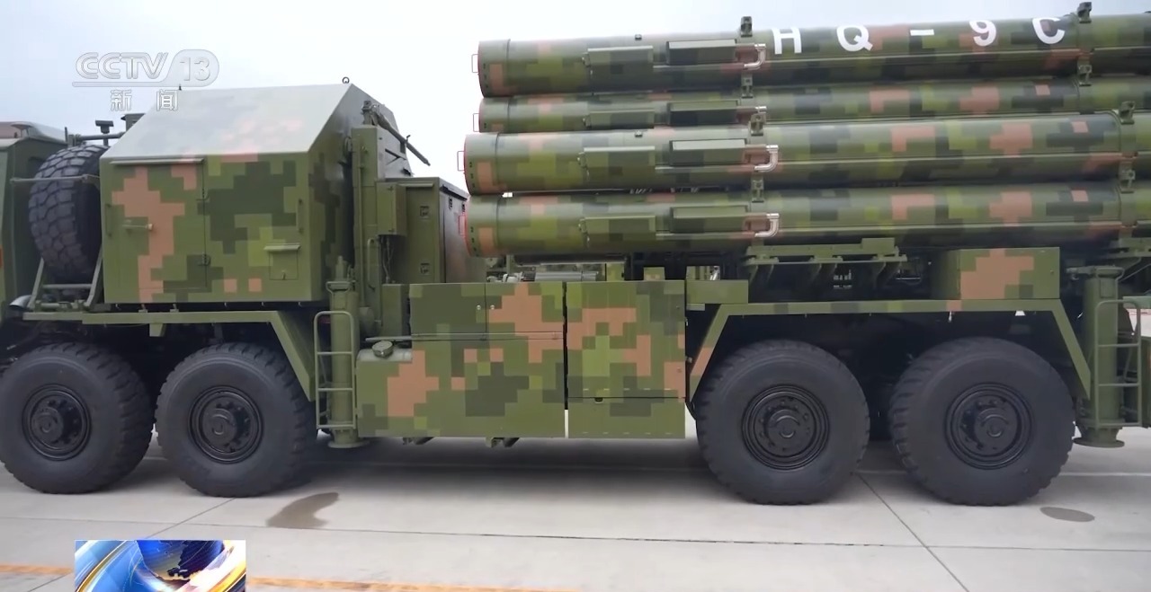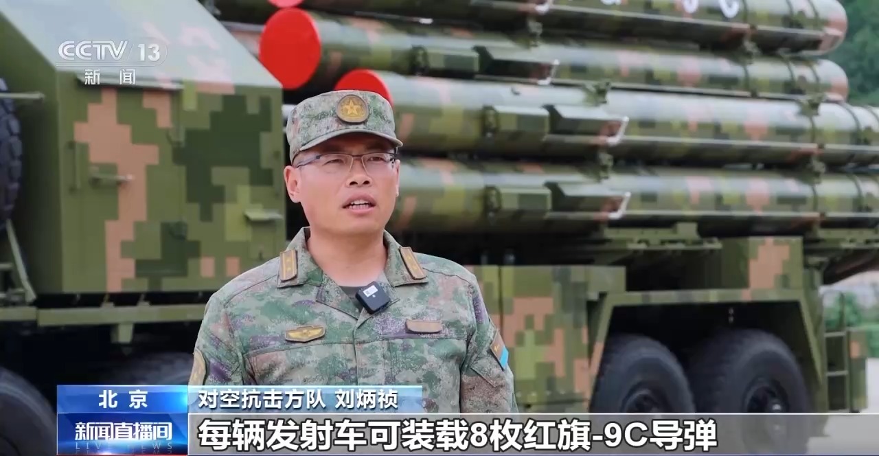 对空抗击方队 刘炳祯:相较红旗-9B而言,每辆发射车可装载8枚红旗-9C导弹,火力密度提高了一倍,具备多弹共架、可远可近的能力特点,在中远程、中低空、抗饱和攻击、抗电磁干扰等方面能力显著提升,有效提高了作战效能。
