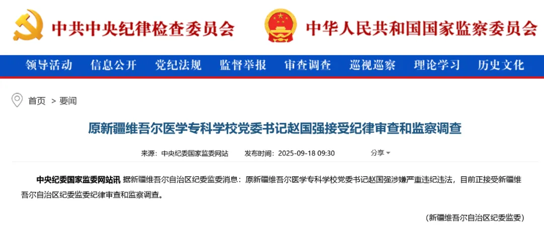 9月18日,中央纪委国家监委网站通报,据新疆维吾尔自治区纪委监委消息:原新疆维吾尔医学专科学校党委书记赵国强涉嫌严重违纪违法,目前正接受新疆维吾尔自治区纪委监委纪律审查和监察调查。