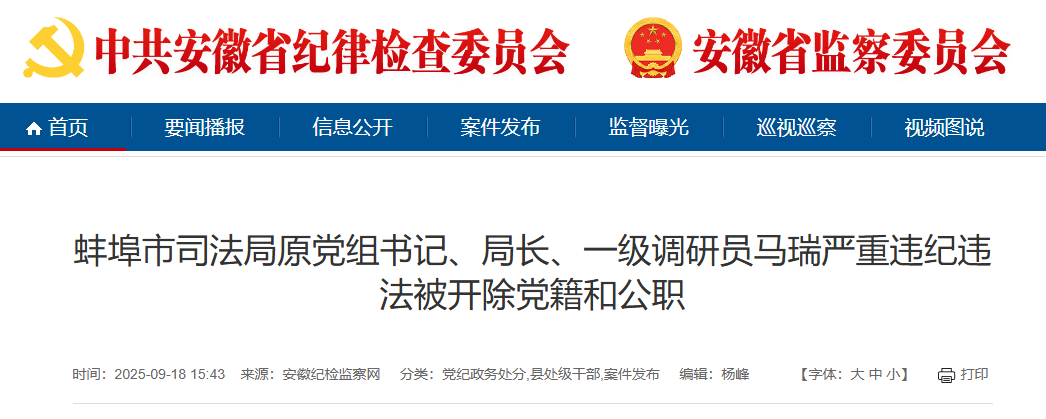 安徽纪检监察网9月18日消息,日前,经中共蚌埠市委批准,蚌埠市纪委监委对市司法局原党组书记、局长、一级调研员马瑞严重违纪违法问题进行了立案审查调查。