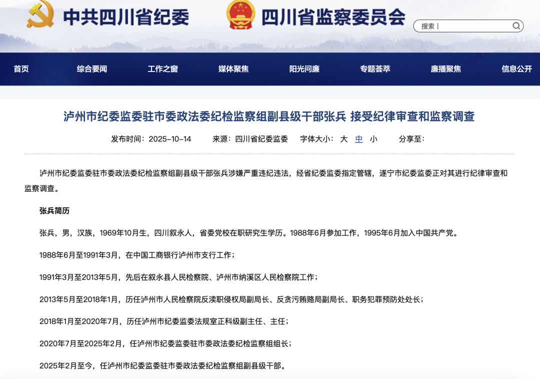 泸州市纪委监委驻市委政法委纪检监察组副县级干部张兵涉嫌严重违纪违法,经省纪委监委指定管辖,遂宁市纪委监委正对其进行纪律审查和监察调查。