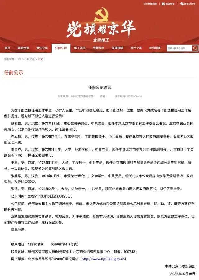 10月16日,中共北京市委组织部发布任前公示通告。