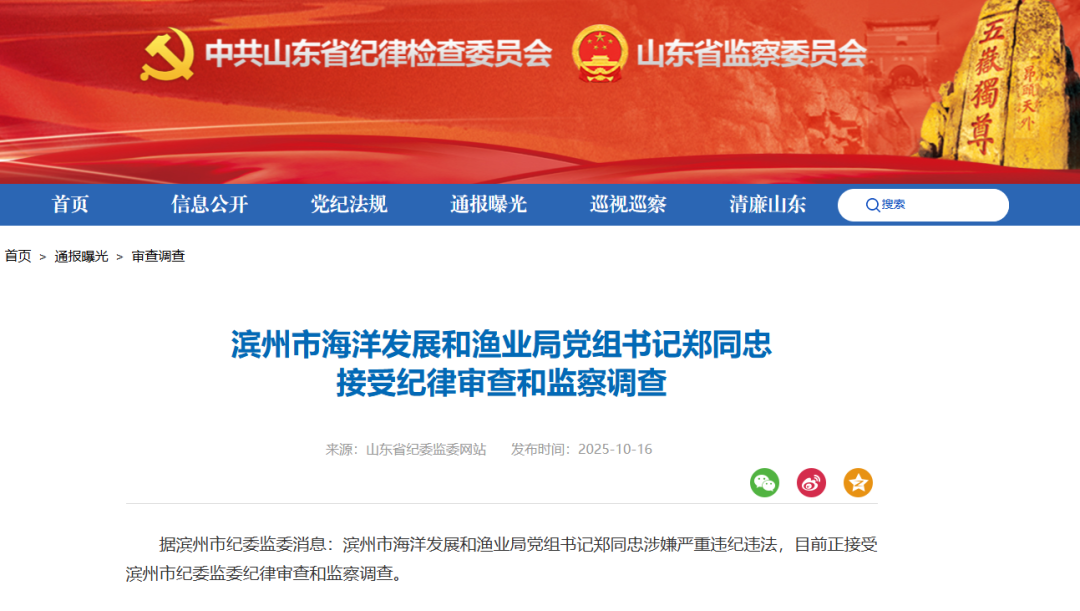 据滨州市纪委监委消息:滨州市海洋发展和渔业局党组书记郑同忠涉嫌严重违纪违法,目前正接受滨州市纪委监委纪律审查和监察调查。