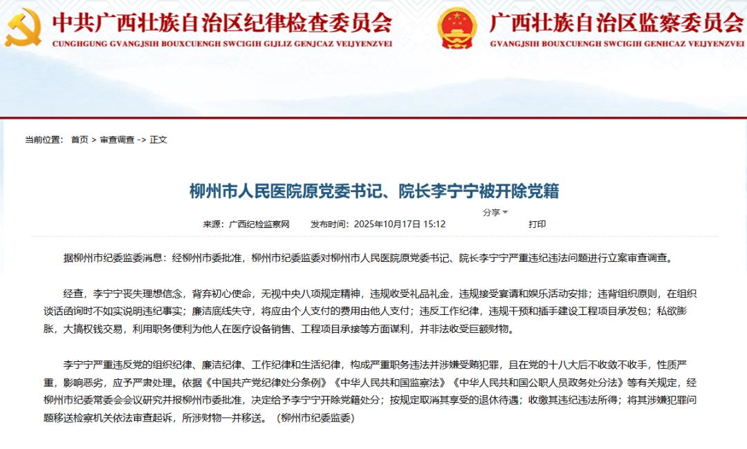 据柳州市纪委监委消息:经柳州市委批准,柳州市纪委监委对柳州市人民医院原党委书记、院长李宁宁严重违纪违法问题进行立案审查调查。