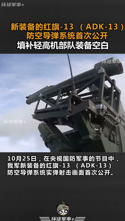10月25日,在央视国防军事的节目中,我军新装备的红旗-13(ADK-13)防空导弹系统实弹射击画面首次公开。