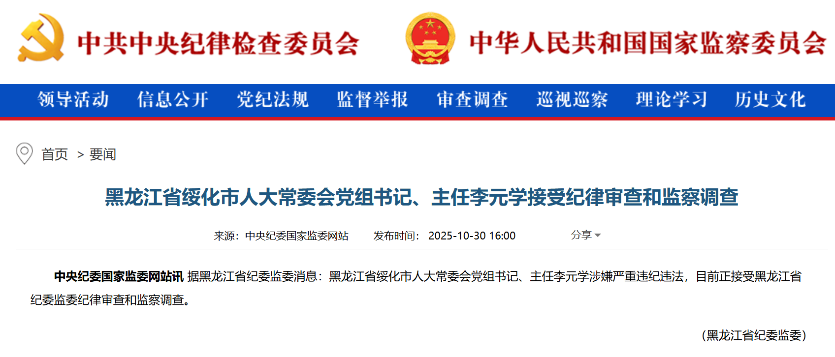 据中央纪委国家监委网站10月30日通报,黑龙江省绥化市人大常委会党组书记、主任李元学涉嫌严重违纪违法,目前正接受黑龙江省纪委监委纪律审查和监察调查。