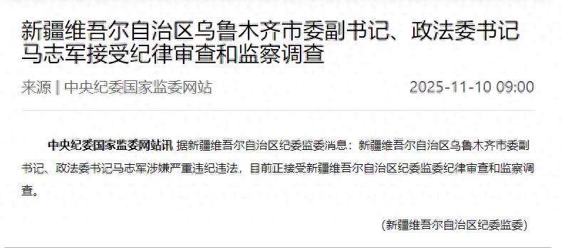 中央纪委国家监委网站讯据新疆维吾尔自治区纪委监委消息:新疆维吾尔自治区乌鲁木齐市委副书记、政法委书记马志军涉嫌严重违纪违法,目前正接受新疆维吾尔自治区纪委监委纪律审查和监察调查。