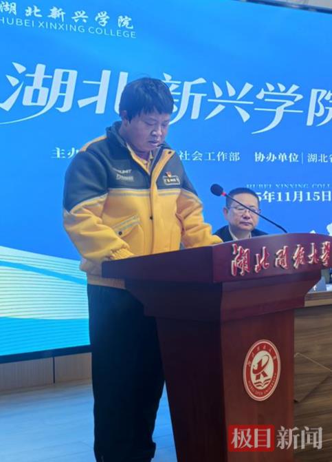 11月15日上午,湖北开放大学鲁巷校区内,41岁的外卖骑手司照天站在湖北新兴学院开学典礼的会场,手中紧握发言稿,神情庄重而期待。作为新就业群体学员代表,这位获评2024年度全国志愿服务“四个100”“最美志愿者”和“湖北好人” 的骑手即将登上讲台,分享自己的心声。